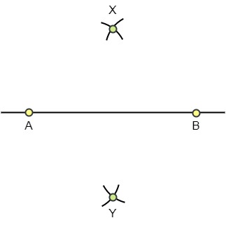 Step 3: Repeat Step 2, this time taking B as the centre. Label the points of intersection as X and Y. Here, AX = BX and AY = BY.