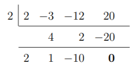 Using synthetic division, we must now check each of the zeros listed above. For simplicity, we make a table to express the synthetic division to test possible real zeros. The row on top represents the coefficients of the polynomial