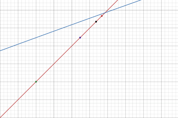 This is a more zoomed-in version and we can see that these points are slowly converging to the intersection. If we add a few lines, we can see our staircase.