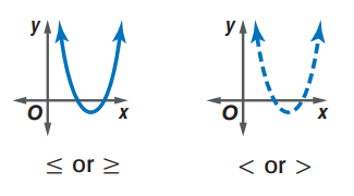 - For inequalities ≤ or ≥, the parabola is solid. This shows that the points on the parabola are solutions.