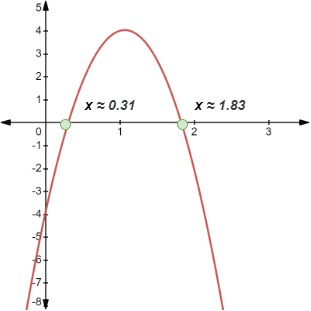The roots can be found using the Quadratic Formula as the expression –7x2 + 15x – 4 cannot be factorized further using standard factoring methods. In doing so, we obtained the following two roots, correct to two decimal places: x ≈ 0.31 and x ≈ 1.83.