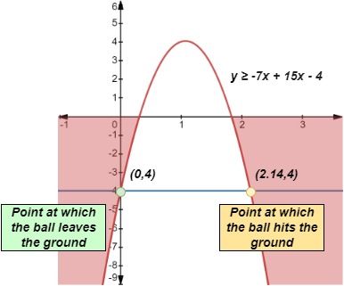Notice that the graph lies below the x-axis when x < 0.31 or x > 1.83. From here, we conclude that the ball is within 6 meters of the ground for the first 0.31 seconds of its flight and again after 1.83 seconds until the ball hits the ground at 2.14 seconds.