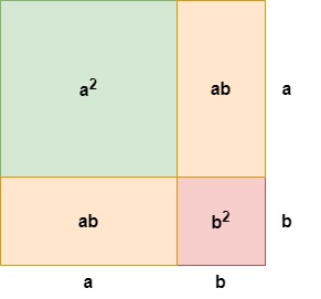Looking at the diagram above, we can see that the large square has an area of . This is made up of the area of the red and green squares and the area of the two identical orange rectangles. Adding these up, we obtain . Thus, we have deduced the first case.