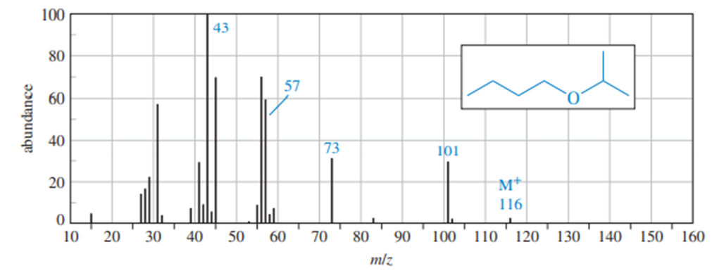 Propose a fragmentation to account for each numbered peak in the mass spectrum of n-butyl isopropyl ether.