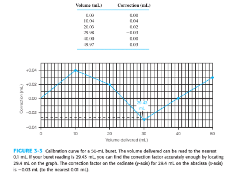 Controlling the appearance of a graph. Figure 3-3 requires gridlines to read buret corrections. In this exercise, you will format a graph so that it looks like Figure 3-3 . Follow the procedure in Section 2-11 to graph the data in the following table. For Excel 2007 or 2010, insert a Chart of the type Scatter with data points connected by straight lines. Delete the legend and title. With Chart Tools, Layout, Axis Titles, add labels for both axes. Click any number on the abscissa ( x axis) and go to Chart Tools, Format. In Format Selection, Axis Options, choose Minimum =0 , Maximum =50 , Major unit =10 , and Minor unit =1 . For Major tick mark type, select Outside. In Format Selection, Number, choose Number and set Decimal places =0. In a similar manner, set the ordinate ( y -axis) to run from -0.04 to +0.05 with a Major unit of 0.02 and a Minor unit of 0.01 and with Major tick marks Outside. To display gridlines, go to Chart Tools, Layout, and Gridlines. For Primary Horizontal Gridlines, select Major & Minor Gridlines. For Primary Vertical Gridlines, select Major & Minor Gridlines. To move axis labels from the middle of the chart to the bottom, click a number on the y axis (not the x axis) and select Chart Tools, Layout, Format Selection. In Axis Options, choose Horizontal axis crosses Axis value and type in -0.04 . Close the Format Axis window and your graph should look like Figure 3-3 .