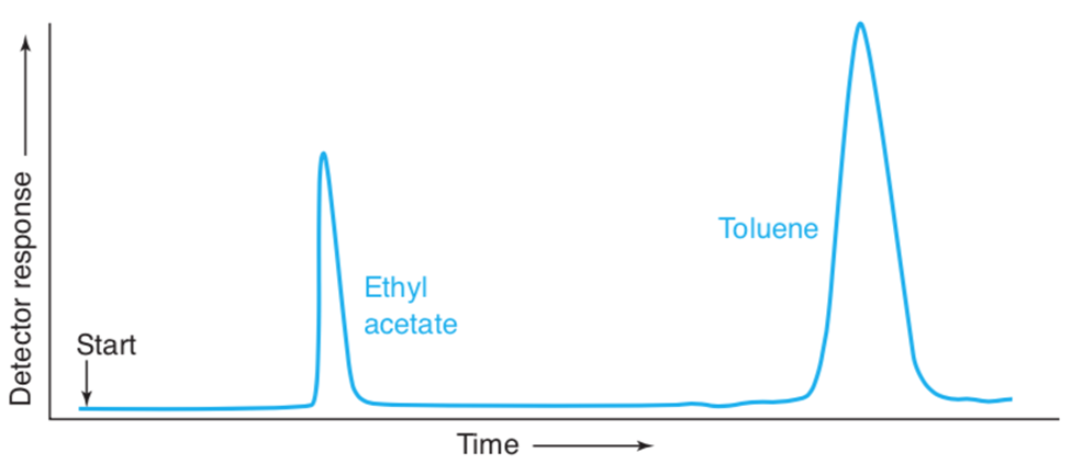 A Gas chromatogram of a mixture of toluene and ethyl acetate is shown here: