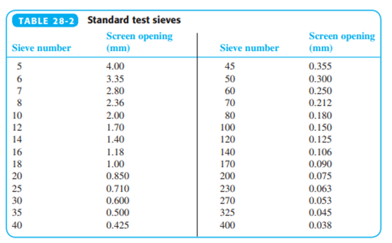 does not pass is retained for your sample. This procedure gives particles whose diameters are in the range \(0.85 - 1.18\;{\rm{mm}}.\) We refer to the size range as \(16/20{\rm{mesh}}.\)