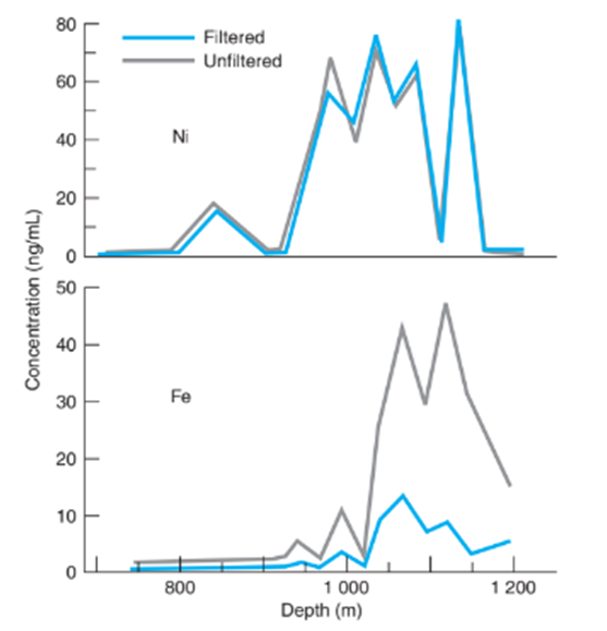 (b) The results given by gray lines were obtained with seawater samples that were not filtered prior to coprecipitation. Colored lines are from filtered samples. Results for Ni do not vary between the two procedures, but results for Fe vary. Explain what this means.