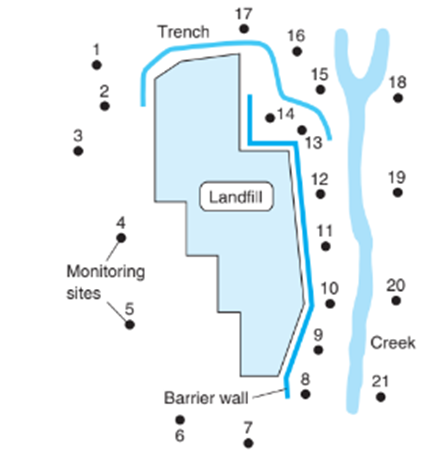 The county landfill in the diagram was monitored to verify that toxic compounds were not leaching into the local water supply. Wells drilled at 21 locations were monitored over a year and pollutants were observed only at sites\(8,11,12\), and 13 . Monitoring all 21 sites each month is very expensive. Suggest a strategy to use composite samples (Box 0-1) made from more than one well at a time to reduce the cost of routine monitoring. How will your scheme affect the minimum detectable level for pollutants at a particular site?