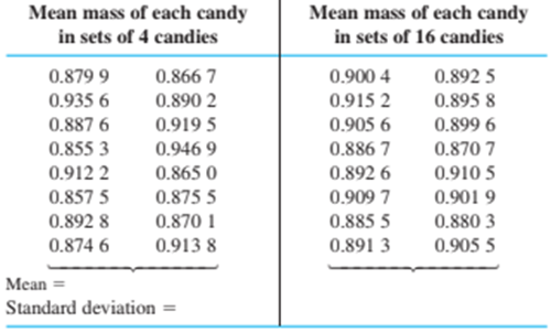 (c) From the standard deviation of the mean values for sets of 4candies, predict what the standard deviation is expected to be for the sets of 16candies. Compare your prediction to the measured standard deviation in (b).