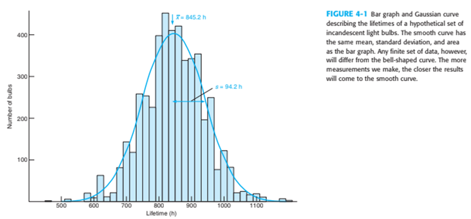 where is the mean value is the standard deviation , total bulbs = 4768, and hours per bar ( = 20) is the width of each bar in Figure 4 - 1. Set up a spreadsheet like the one with this problem to calculate the coordinates of the Gaussian curve in Figure 4 - 1 from 500to 1200hin 25 - hintervals. Note the heavy use of parentheses in the formula at the bottom of the spreadsheet to force the computer to do the arithmetic as intended. Use Excel to graph your results.