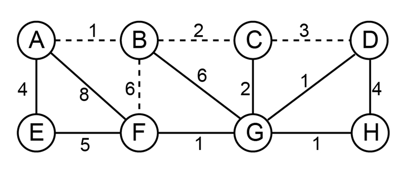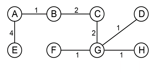 There really are (B,F) , (B,C), and (B,G) edges for the " B " vertex. The prices for (B,F) = 6, (B,C) = 2, and (B,G) = 6 are all the same. Look for the vertices (B,F) , (B,C), and (B,D) with the lowest cost (B, G) The cost of (B,C) = 2 is the cheapest. As a result, double the current cost by the prior value.
