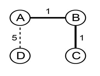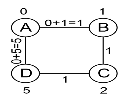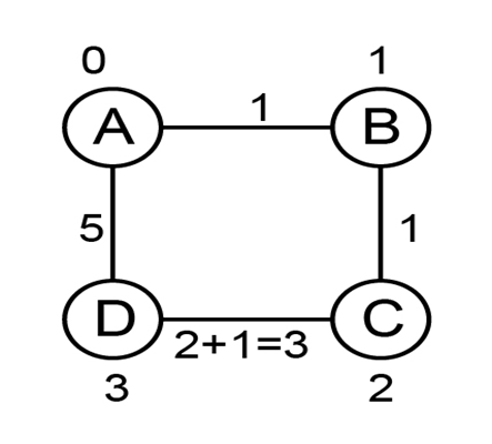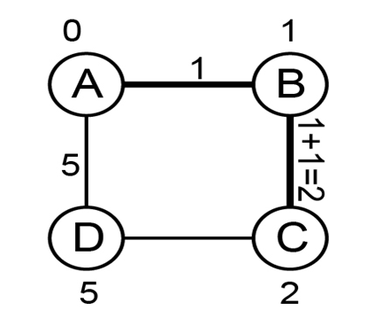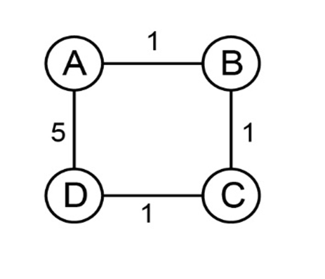 The cost of path A to B is "1," cost of path B to C is "1," cost of path C to D is 1" and cost of road D to A is "5" as illustrated in the graph " G " below: