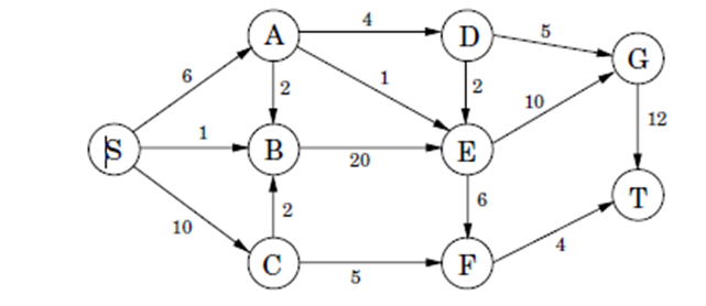 For the following network, with edge capacities as shown, find the maximum flow from S to T, along with a matching cut.