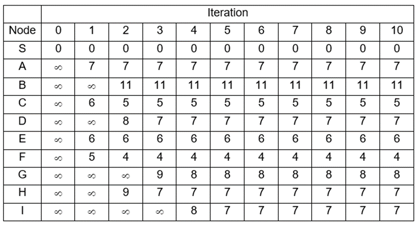 The table that illustrates the Bellman-Ford algorithm’s values: