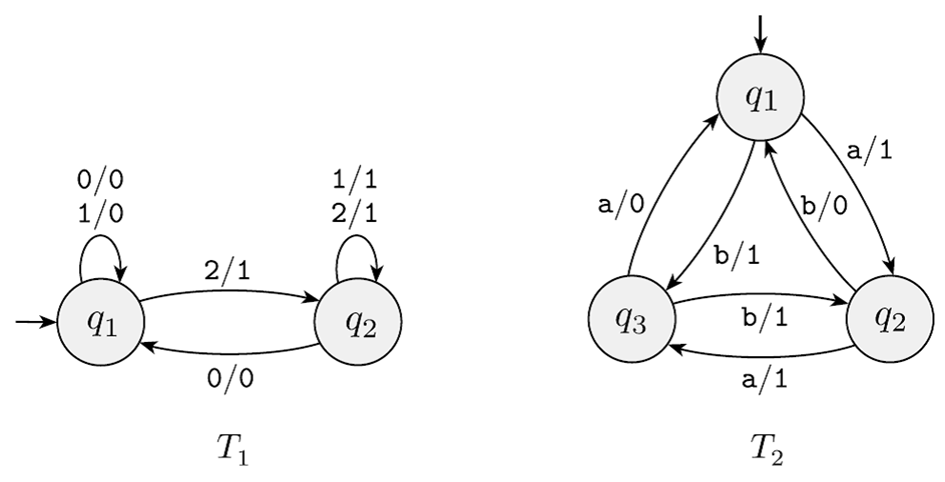 Question: Give the formal description of the machines M1 and M2 pictured in