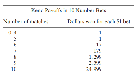A game popular in Nevada gambling casinos is Keno, which is played as follows: Twenty numbers are selected at random by the casino from the set of numbers through . A player can select fromto numbers; a win occurs if some fraction of the player's chosen subset matches any of the numbers drawn by the house. The payoff is a function of the number of elements in the player's selection and the number of matches. For instance, if the player selects only 1 number, then he or she wins if this number is among the set of , and the payoff is won for every dollar bet. (As the player's probability of winning in this case is , it is clear that the "fair" payoff should be won for every bet.) When the player selects 2 numbers, a payoff (of odds) of won for every \)1 bet is made when both numbers are among the
