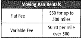 The table shows the cost of renting a moving van. If Miguel budgeted $75, how many miles could he drive the van and maintain his budget?