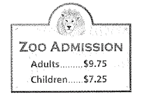 ZOO At a zoo, the cost of admission is posted on the sign. Find the cost of admission for two adults and two children. (Lesson 1-3)