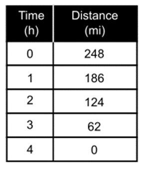 The table shows the function relating the distance to an amusement park in miles and the time in hours the Torres family has driven. Find the - and - intercepts. Describe what the intercepts mean in this situation.