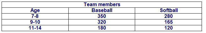 For Exercises 11 and 12, use the table below that shows the number of kids registered for baseball and softball