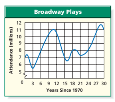 For Exercises 46–48, use the graph that models the attendance to Broadway plays (in millions) from 1970-2000.