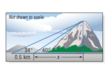 A geologist measured a angle of elevation to the top of a mountain. After moving 0.5 km farther away the angle of elevation was . How high is the top of the mountain?