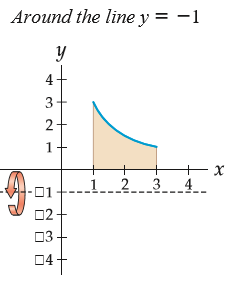 Consider the region between the graph of and the x-axis on [1,3]. For each line of rotation given in Exercises 31– 34, use definite integrals to find the volume of the resulting solid.