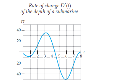 During World War II, a handful of German submarines were captured by the Allies to get access to German codes. On one of these submarines, the submarine’s depth had been plotted carefully as D(t), in meters, where t measures the number of hours after noon on that day. Unfortunately, during the capture, the information about D(t) was lost. However, the following graph of the rate of change D'(t) of the submarine’s depth was recovered: