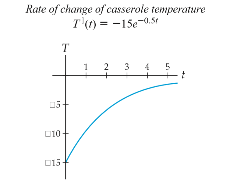 Dad’s casserole surprise is for dinner again, and from previous experiments we know that after the casserole is taken out of the oven, the temperature of the casserole will cool by changing at a rate of T (t) =degrees Fahrenheit per minute.
