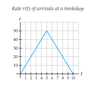 A specialty bookshop is open from 8:00 a.m. to 6:00 p.m. Customers arrive at the shop at a rate r(t) arrivals per hour. A graph of r(t) for the duration of the business day is shown here, where t is the number of hours after the shop opens at 8:00 a.m. As a group, the salespeople in the bookshop can serve customers at a rate of 30 customers per hour. If there are no salespeople available, customers have to wait in line until they can be served, and the customers are willing to wait as long as is necessary in this line. Use the graph ofr(t) to estimate answers to the questions that follow.
