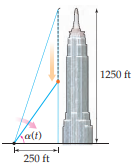(b) Find a formula for the rate at which the angle of elevation \alpha(t) is changing at time , and use the formula to determine the rate of change of the angle of elevation at the time the penny hits the ground.