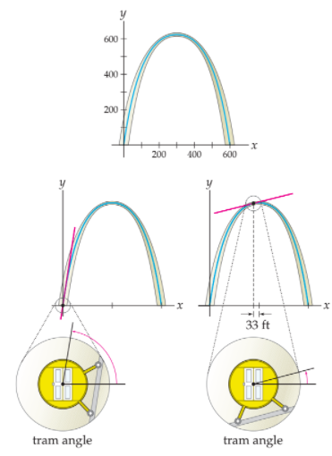 (b) There is a tram that takes visitors to an observation deck in the top of the arch. The cabin of the tram rotates rather like cars on a Ferris wheel to keep visitors upright, but the outer part of the tram changes angle with the curve of the arch. What angle does the tram make with the ground at the bottom of the arch?