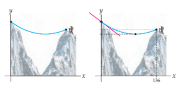 The point x = 0 is where the rope attaches to the main peak, while x = 136 is where it attaches to the pinnacle. Heights are measured in feet above the notch. (This exercise involves hyperbolic functions.)