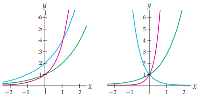 The graphs of the exponential functions and are shown in the figure at the left. Use your knowledge of transformations to determine which graph is which without using a graphing calculator.