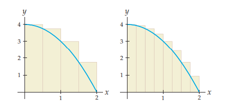 (a) Use the four rectangles shown on the left to approximate the given area, and then use the eight rectangles shown on the right to obtain another approximation of that area. Be sure to use the fact that the graph shown is that of the function in your calculations.