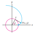 The involute of a circle is the curve described by the endpoint P of a thread as it unwinds from a fixed circular spool. For simplicity suppose that the radius of the circular spool is r and that when the spool is placed with its center at the origin, the point P starts at (r, 0). Assume that the thread is unwinding counterclockwise. Find parametric equations for the point P. (Hint: If the string is taut at all times as it unwinds, the length of segment PT is rθ.)