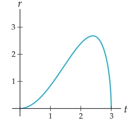 Your local weatherman predicts that there will be a rainstorm this afternoon for three hours and that the rate of rainfall will be given by for those three hours from to , as shown in the figure. Use integration by parts (twice) to solve the definite integral that represents the total amount of rainfall predicted for the storm. Compare this exercise 83 in section 5.1, where you used u-substitution to solve the same problem.