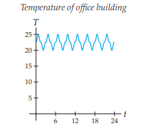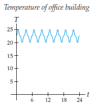 An office building has a thermostat that keeps the temperature between \(20\) and \(26\) degrees Celsius for \(24\) hours a day. As the heating and cooling units alternate, the temperature starting from midnight is given by