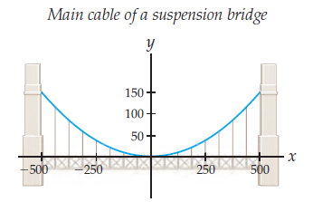 The main cable on a certain suspension bridge follows a parabolic curve with equation \(f (x) = (0.025x)^2\), measured in feet, as shown in the following figure: