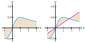 (b) Find the area between the graph of f(x) and the graph of on [−1, 3] shown next at the right.