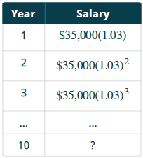Salary Jamal’s boss gives him a 3% raise every year on his birthday. This means that each year, Jamal’s salary is 1.03 times his last year’s salary. If his original salary was \(35,000, his salary after 1 year was , after 2 years was , after 3 years was , as shown in the table below. What will Jamal’s salary be after 10 years? Simplify the expression, to show Jamal’s salary in dollars.