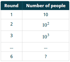Email Kate emails a flyer to ten of her friends and tells them to forward it to ten of their friends, who forward it to ten of their friends, and so on. The number of people who receive the email on the second round is , on the third round is , as shown in the table below. How many people will receive the email on the sixth round? Simplify the expression to show the number of people who receive the email.