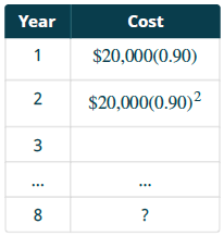 Depreciation Once a new car is driven away from the dealer, it begins to lose value. Each year, a car loses 10% of its value. This means that each year the value of a car is 90% of the previous year’s value. If a new car was purchased for \(20,000, the value at the end of the first year would be and the value of the car after the end of the second year would be . Complete the table shown below. What will be the value of the car at the end of the eighth year? Simplify the expression, to show the value in dollars.