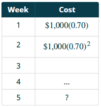 Clearance A department store is clearing out merchandise in order to make room for new inventory. The plan is to mark down items by 30% each week. This means that each week the cost of an item is 70% of the previous week’s cost. If the original cost of a sofa was \(1,000, the cost for the first week would be \)1,000(0.70) and the cost of the item during the second week would be $1,000(0.70)2 . Complete the table shown below. What will be the cost of the sofa during the fifth week? Simplify the expression, to show the cost in dollars.