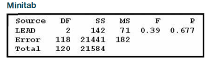 5. Lead and Verbal IQ Scores Example 1 used measured performance IQ scores for three different blood lead levels. If we use the same three categories of blood lead levels with measured verbal IQ scores, we get the accompanying Minitab display. (The data are listed in Data Set 7 鈥淚Q and Lead鈥 in Appendix B.) Using a 0.05 significance level, test the claim that the three categories of blood lead level have the same mean verbal IQ score. Does exposure to lead appear to have an effect on verbal IQ scores?