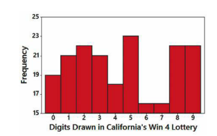 Win 4 Lottery Shown below is a histogram of digits selected in California鈥檚 Win 4 lottery. Each drawing involves the random selection (with replacement) of four digits between 0 and 9 inclusive.