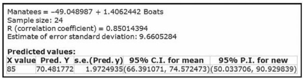 Interpreting a Computer Display. In Exercises 9鈥12, refer to the display obtained by using the paired data consisting of Florida registered boats (tens of thousands) and numbers of manatee deaths from encounters with boats in Florida for different recent years (from Data Set 10 in Appendix B). Along with the paired boat, manatee sample data, Stat Crunch was also given the value of 85 (tens of thousands) boats to be used for predicting manatee fatalities.