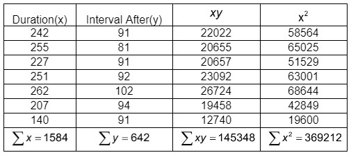 Using the listed duration and interval after times, find the best predicted 鈥渋nterval after鈥 time for an eruption with a duration of 253 seconds. How does it compare to an actual eruption with a duration of 253 seconds and an interval after time of 83 minutes?