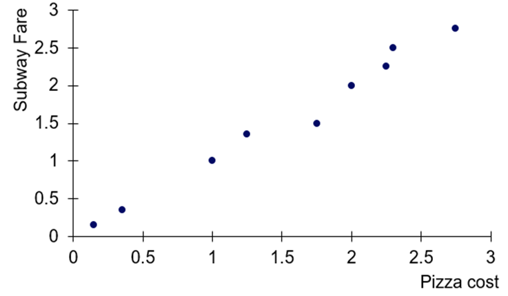 Pizza and the Subway The 鈥減izza connection鈥 is the principle that the price of a slice of pizza in New York City is always about the same as the subway fare. Use the data listed below to determine whether there is a significant linear correlation between the cost of a slice of pizza and the subway fare.